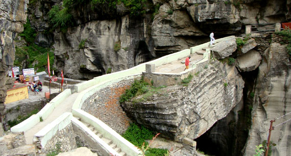 Bheem Pul is situated opposite to the Vyas Gufa in Mana Village. It is a huge rock which acts as a natural bridge across the Saraswati River. The Saraswati River flows with force in between the two mountains and joins the Alaknanda River. It is believed that Bheem, one of the five Pandavas, threw a huge rock in order to make a path to join the two mountains so that Draupadi could easily walk over it.